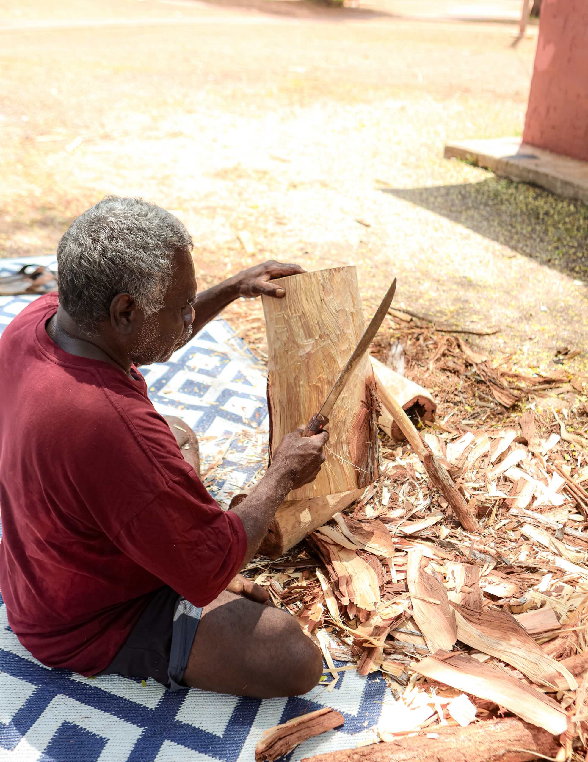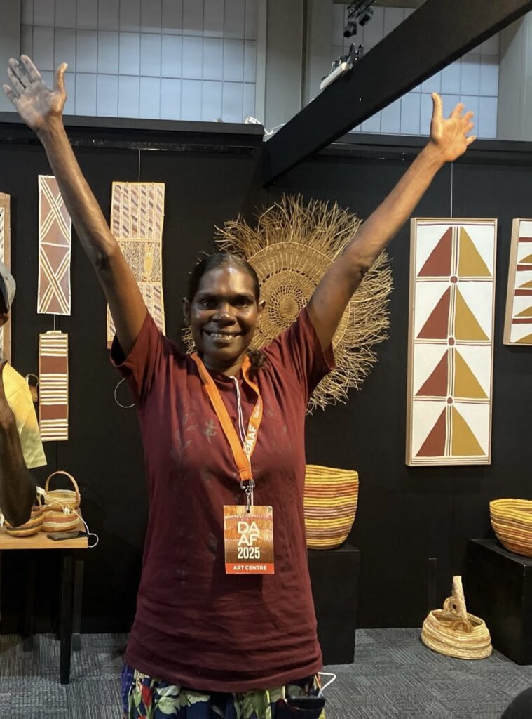 David Roy is a prolific maker of carvings and bark paintings associated with his clan waŋarr (dreamings) which include the Ḻarradjadja (Barracuda), Buruŋgurr (Pelican), Djarrak (Sea Eagle), Ḏikarr (Flying Fish) and Nyaŋbal (Sea Dollars). His clan owns islands to the north and east of Milingimbi in the deep salt water including Galawin’ku (Elcho Island) and Murruŋga. The Yarrang tells of how Larradjadja lays his eggs to the east of Murruŋga Island before travelling north-west. His teeth are represented by the serrated upright pieces on the top of Mäḻarra hollow logs, which are traditionally used for burial rights.