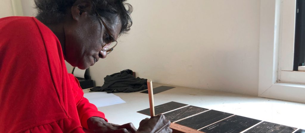 Under the guidance of her family, Biyay’ŋu has delved into using locally harvested materials to create weavings, and ochre works on bark and shell. She has also extended her practice to printmaking processes including etching.