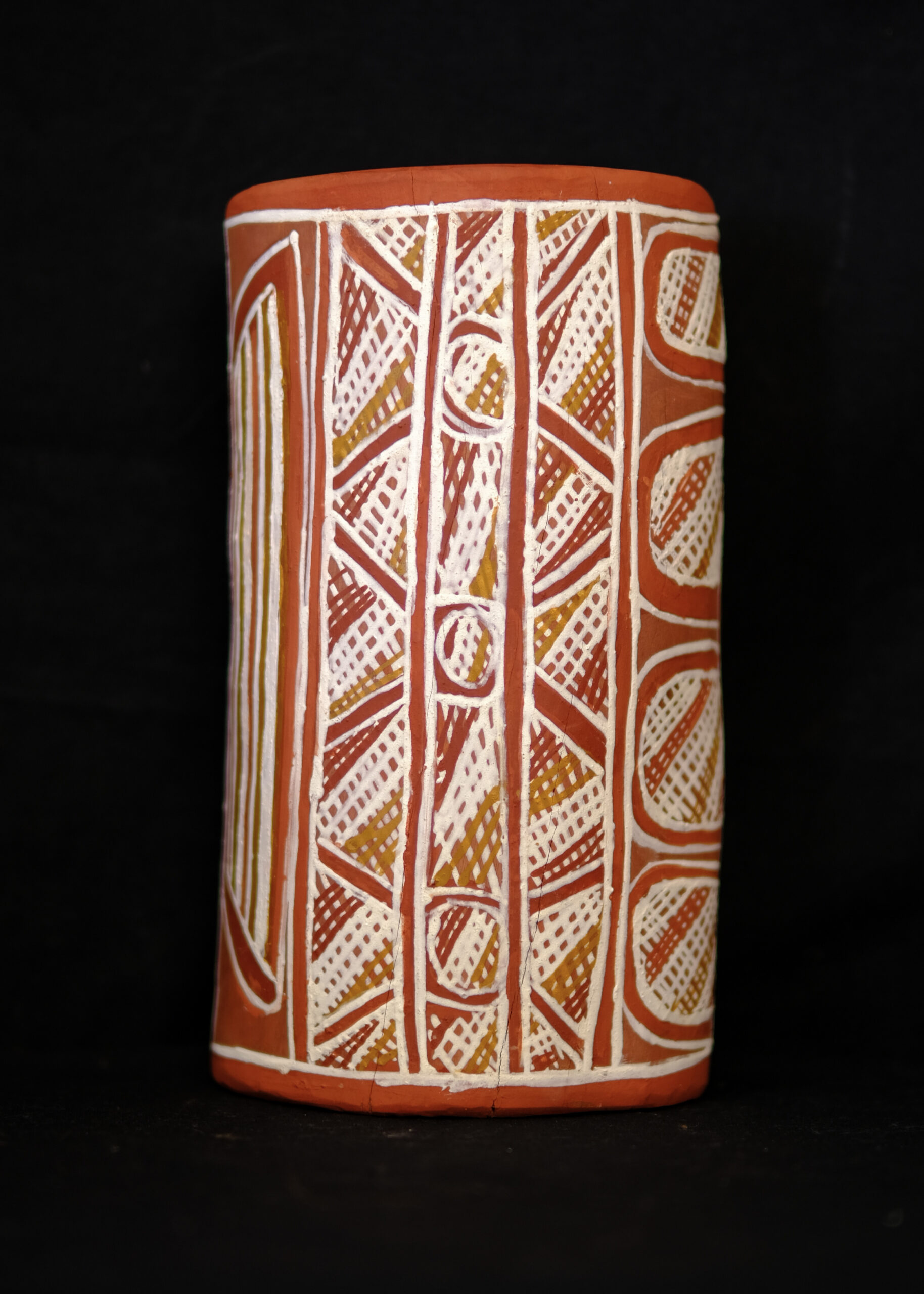 On one side you can see the Ḏurrurrŋa oyster design. You can see the oysters represented by the semi-circular forms. In the centre you can see a Garrawurra design showing the milminydjarrk (sacred water holes). The rarrk (cross-hatching) shows the fresh water and salt water mixing, and the water coming all the way up to Gärriyak.