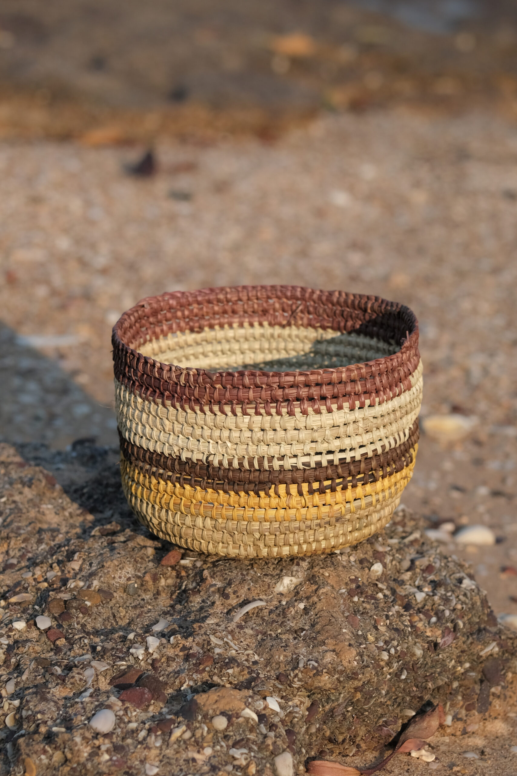 The new shoots of the pandanus palm are plucked from the central crown of the tree. The fine serrated edges are removed by running a fingernail down each side of the frond, which is then split into two and peeled to expose the inner fibre. Using extensive knowledge of local vegetation, these strips are then dyed using colours extracted from the leaves, roots and bark of selected native plants and left to dry in the sun. Following this lengthy process, the artist weaves the prepared fibres into their desired form.